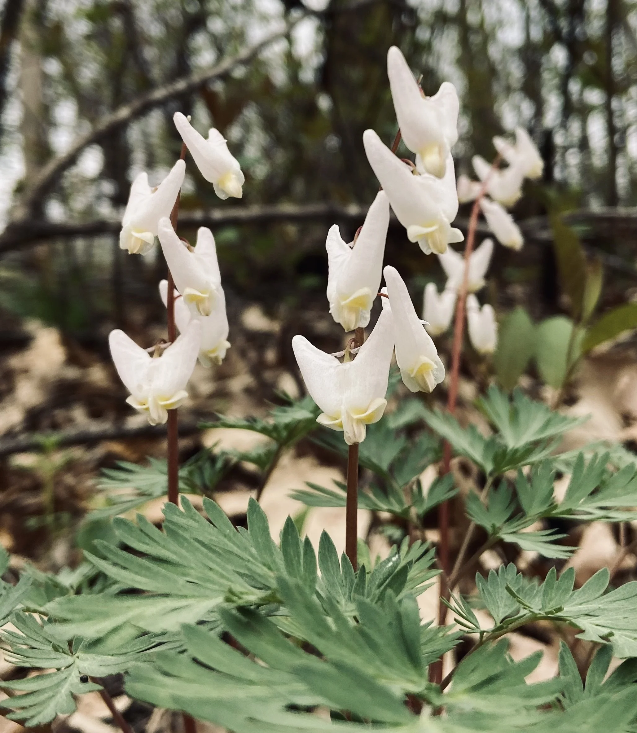 I smile enjoying their energetic passion as they lunge down the trail like two praying mantises. I declined the offer to try out their favored walking aids. I was more intent on hearing about all the flowers my mom was discovering that afternoon. We were glad we wore our heavier coats. When the sun was covered by a passing cloud the spring air did not feel warm, but suddenly colder with a gust of wind blowing through the tall barren trees. In a month the woods would be dense with leafage, but for now, the leaves are small and light green as they dot the surroundings like verdant surprises. We oohed and ahhed at the budding Bluebells, the first Violets, and the tiny white Dutchman Breeches blossoming in the thicket. My mom and dad laughed together as we walked along with the aid of their sticks.